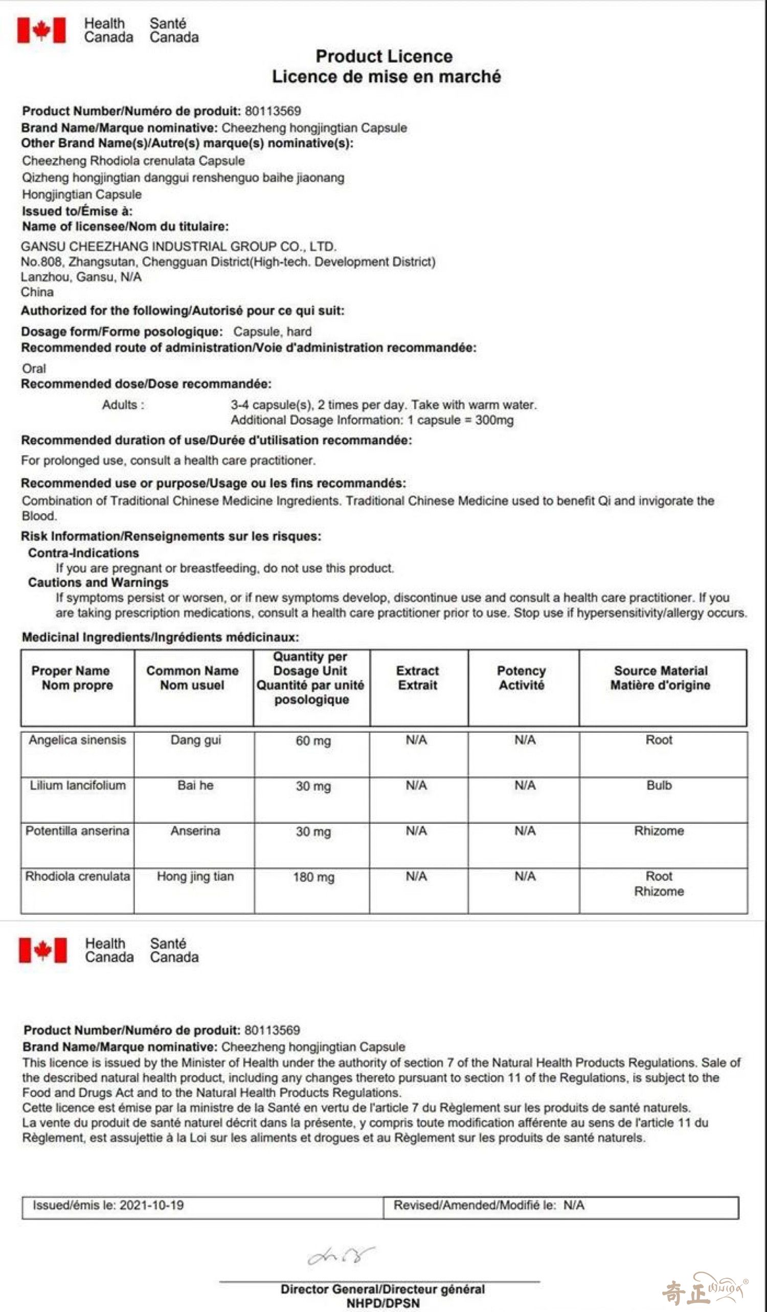 加拿大GMP證書-奇正紅景天當歸人參果百合膠囊