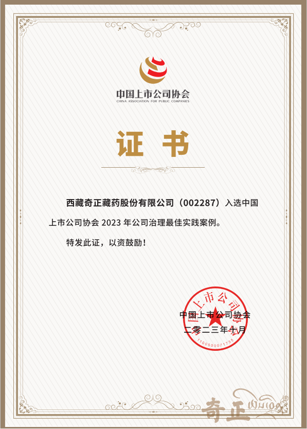 近日,“中國(guó)上市公司協(xié)會(huì)2023年公司治理最佳實(shí)踐案例”評(píng)選結(jié)果揭曉,奇正藏藥通過(guò)嚴(yán)格的遴選和評(píng)審程序,從5000多家A股上市公司中脫穎而出,入選最佳實(shí)踐案例,并被收錄至《中國(guó)上市公司治理報(bào)告》。