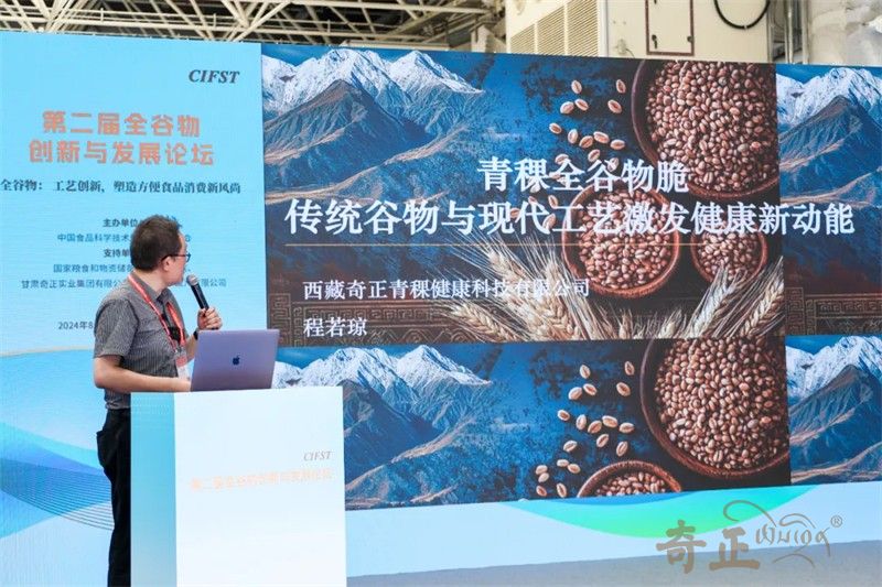 甘肅奇正實(shí)業(yè)集團(tuán)有限公司總經(jīng)理、西藏奇正青稞健康科技有限公司董事長(zhǎng)程若瓊先生在大會(huì)發(fā)表講話,圍繞“青稞全谷物脆:傳統(tǒng)谷物與現(xiàn)代工藝激發(fā)健康新動(dòng)能?”提出:青稞是全谷物家族的新勢(shì)力。